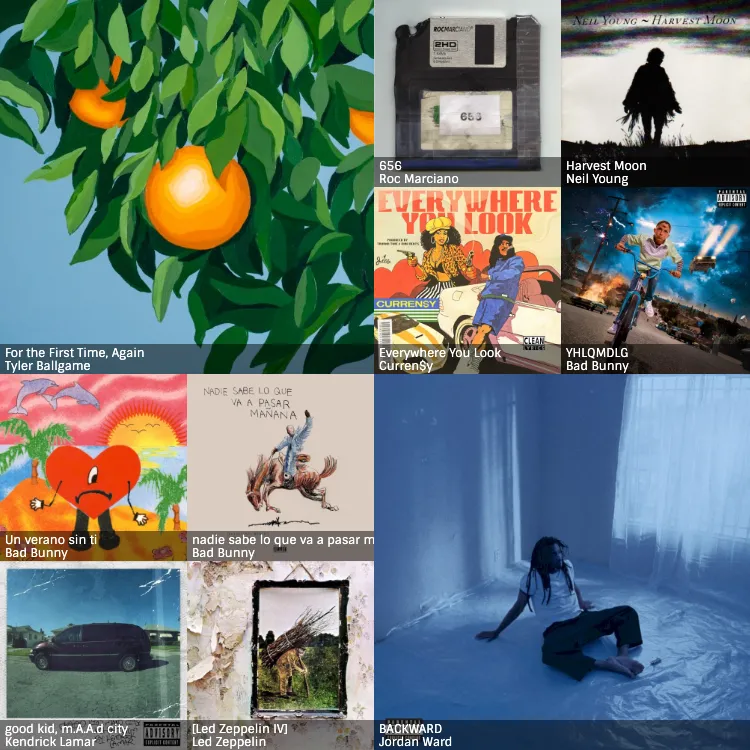 The “Phantom of the Opera” earworm has relented. I did a lot of album listening of new releases this week. The collage above from Listen Brainz shows a mix of old favorites (good kid, m.A.A.d city, Un verano sin ti, Harvest Moon) and cool new finds (Backward, For the First Time, Again).