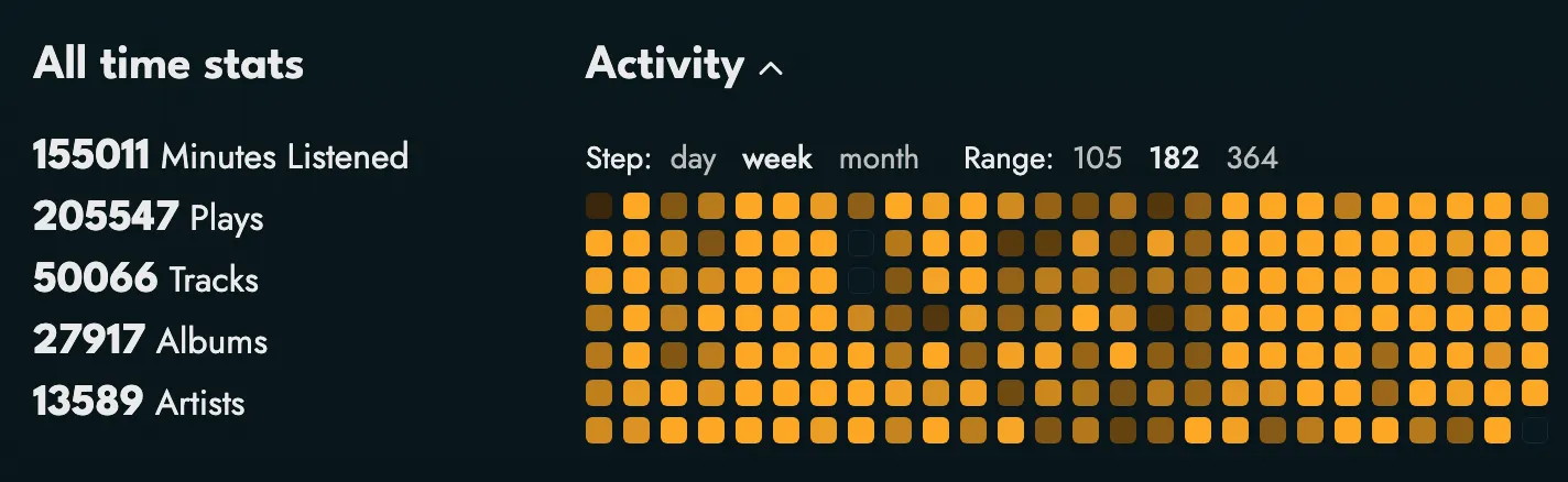 I really like koito because of how nicely it lets me own my scrobbling data. This week, I exported 200,000 scrobbles from both my last.fm accounts and let koito import this data. (One account briealeida has scrobbles from 2006-2014 and my current account bbbbbbbbrie has everything after that.)